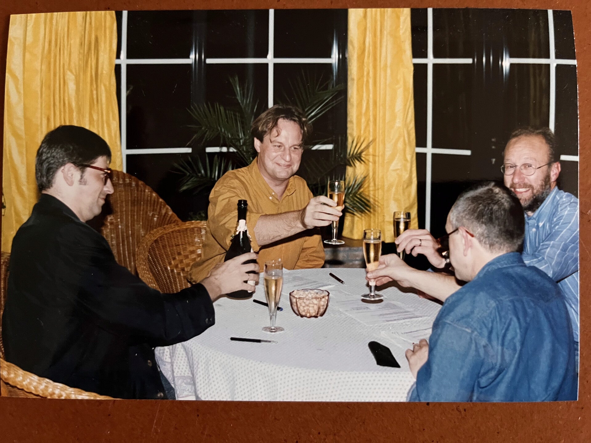 Foto 7: IBBY-Congres Basel 2002: Jant van der Weg, Aidan Chambers, Toin Duijx en Wally De Doncker